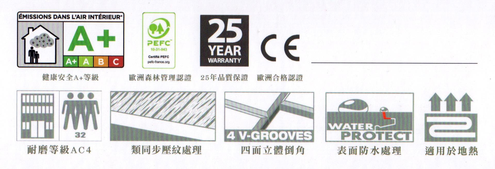 歐洲耐磨等級AC4,使用專利 X clip安裝方式,穩定性加倍,防潮品質效果更佳。法國頂級橡木紋有別於一般木紋花色,類同步浮雕木紋,四面倒角設計,品質優美。超低甲醛符合國家標準E1,健康更安心。